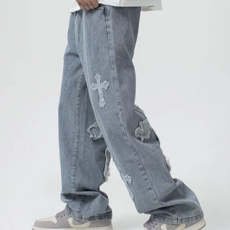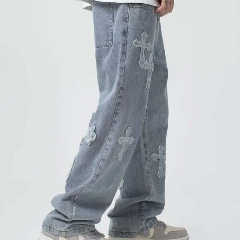 2025 new high street loose white cross jeans men's jeans Y2k loose pants loose cross design straight leg jeans men's