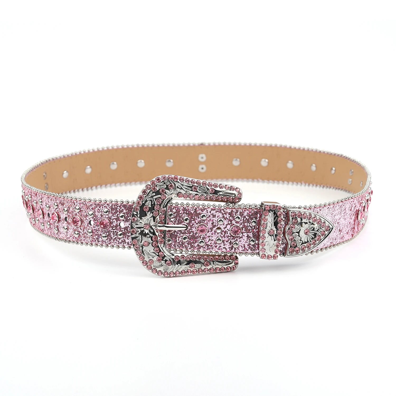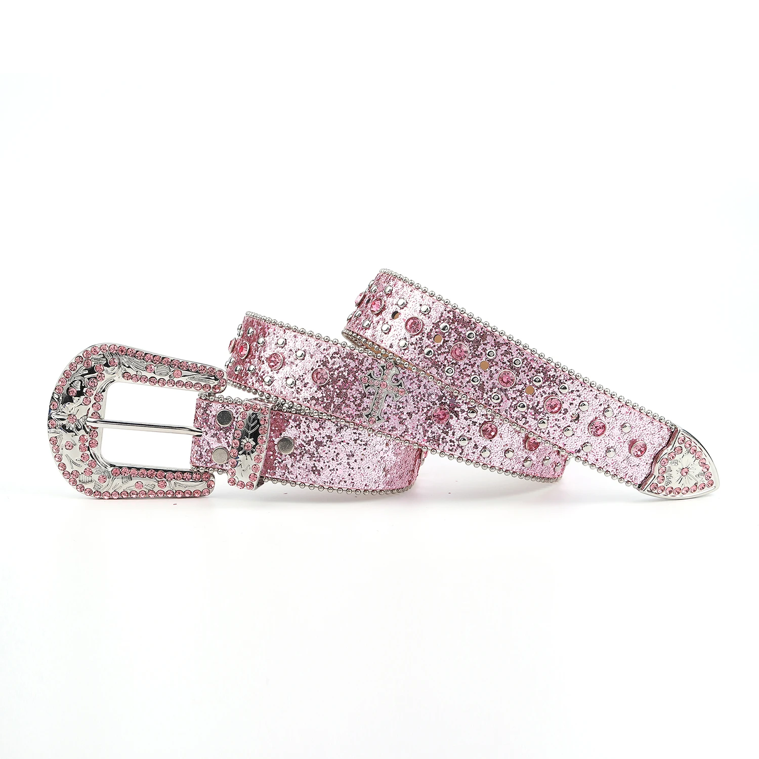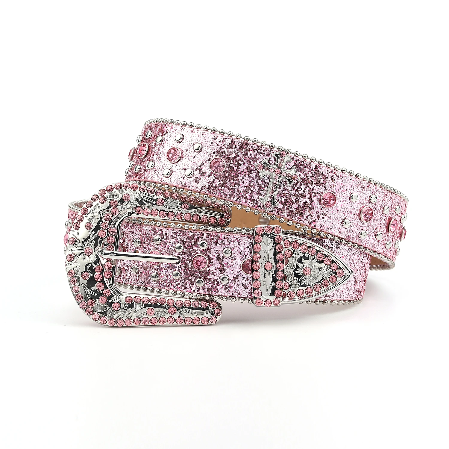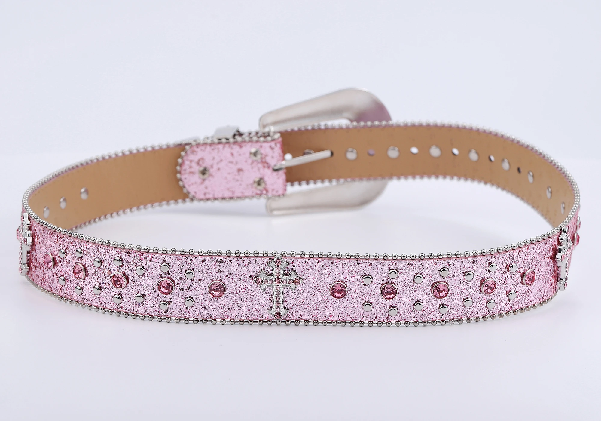 Pink cross-rivet Rhinestone belt sparkles, punk rock inlaid leather belt for men's jeans