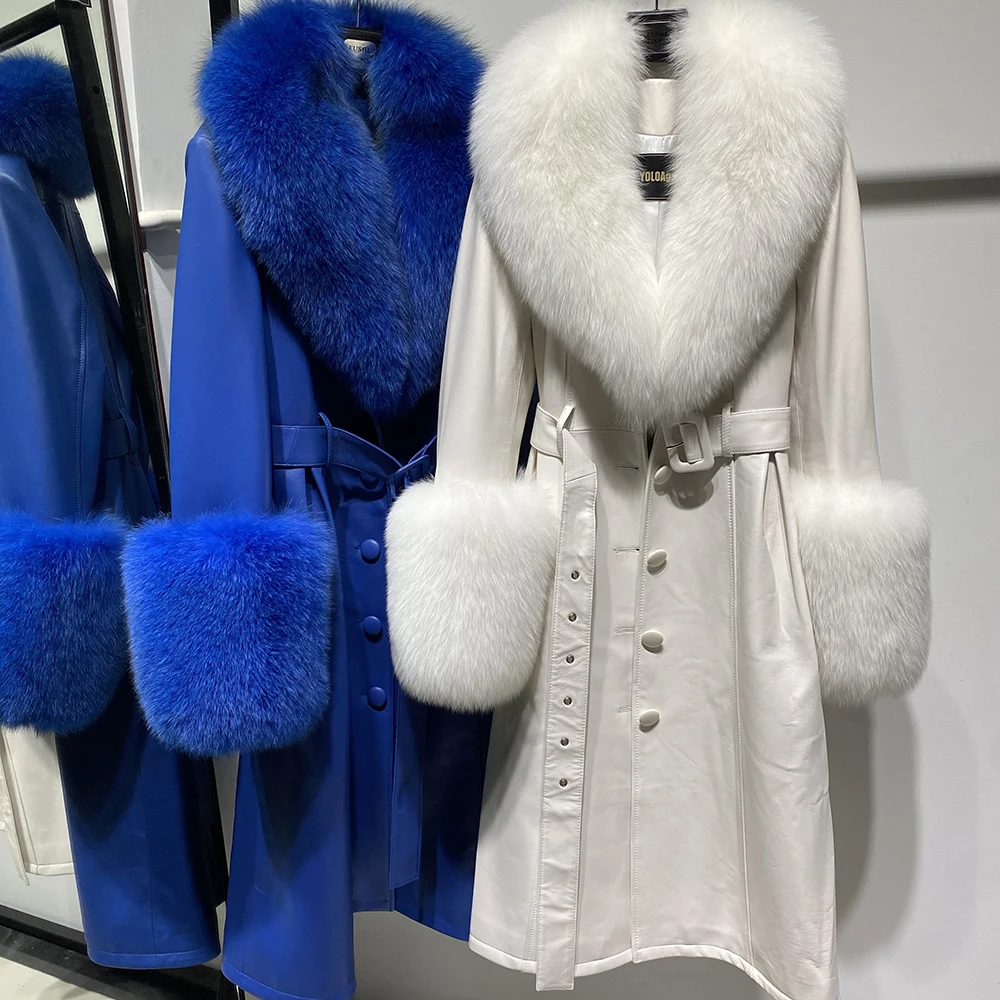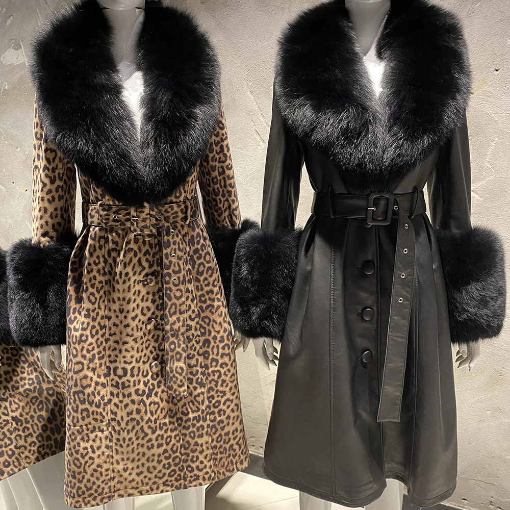 YOLOAgain Women's Mongolia Sheep Fur Collar Leopard Print Real Leather Jacket Coat Long